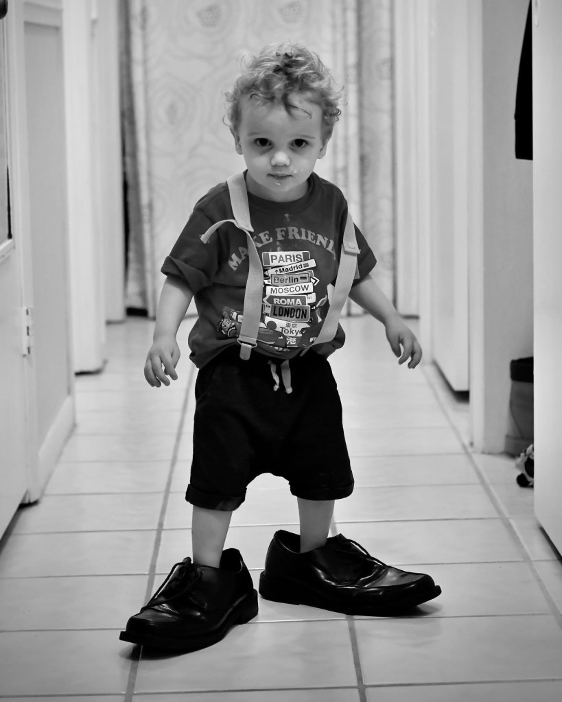 I Minutes later, Jack stood—one shoe on each foot. His toes disappeared somewhere near the tongue. He gripped the walls like a cruise passenger in choppy waters. “I’m walking like a boss,” he announced, before immediately wiping out beside the laundry basket.