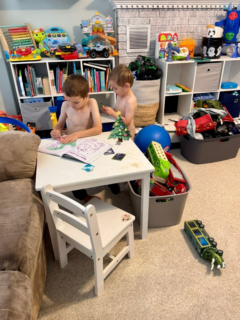 We froze. James had a green Sharpie in one hand and a Rudolph nose drawn on his belly button. I had “HO HO HO” written across my chest like a tiny holiday billboard.