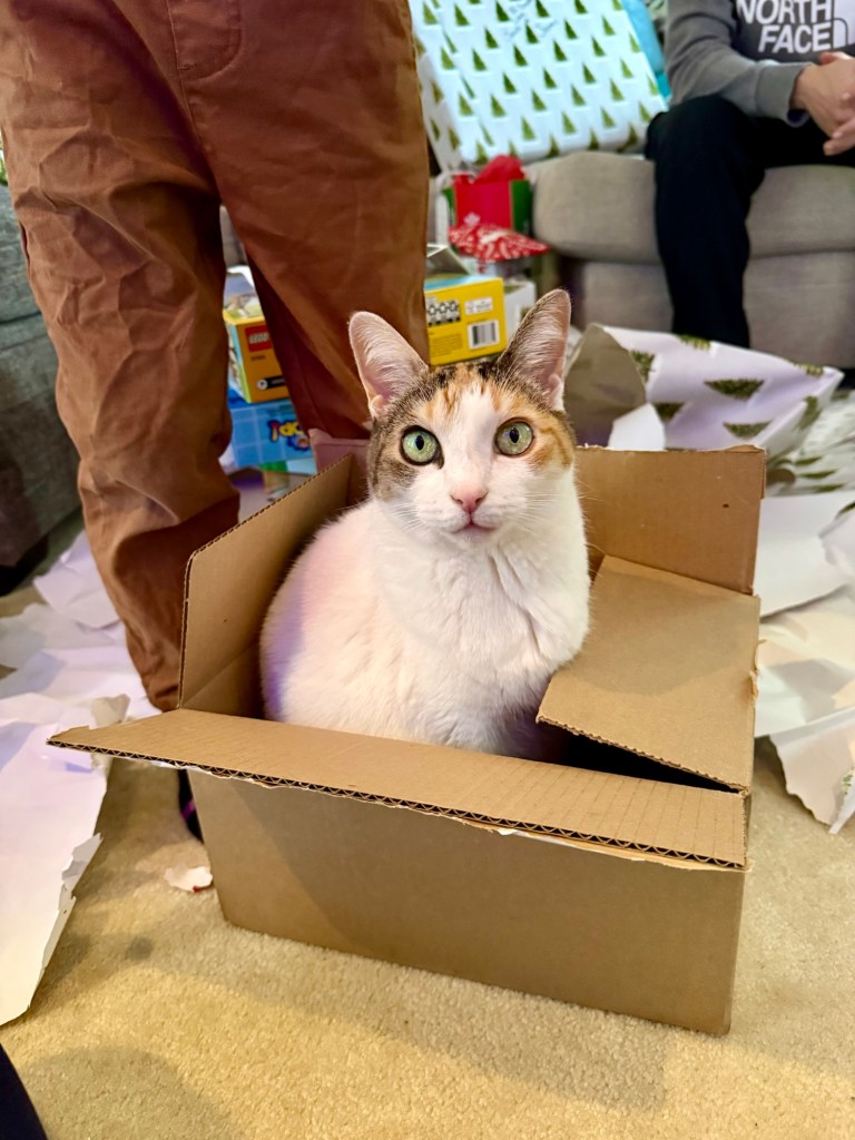 A Hot Wheels track skidded past me. I leapt onto the largest present — the one with the prettiest bow — and claimed it as my throne. You tried to angle around me. I shifted slightly so I blocked the shot again. Consider it a lesson.