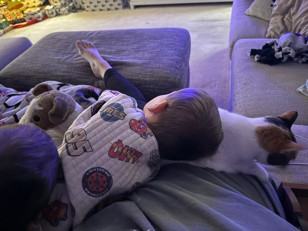 For a moment — a rare, shimmering moment — the pookie cat settles on me like a warm, purring badge of honor. James is curled into my side, serene as a woodland creature in a children’s book. Jack is draped across him in perfect sibling alignment, not a single elbow weaponized, not a single knee deployed in protest.